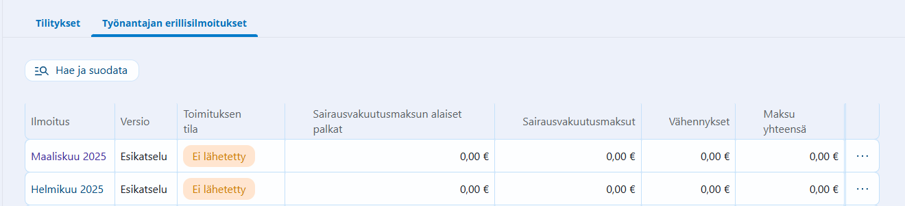 Tässä osiossa voit tarkastella, lähettää ja korjata kuukausittaisia työnantajan erillisilmoituksia Tulorekisteriin.