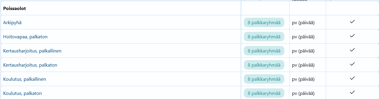 - Vaikuttaa lomaoikeuteen: Määritä, vaikuttaako kirjauslaji vuosilomakertymään.