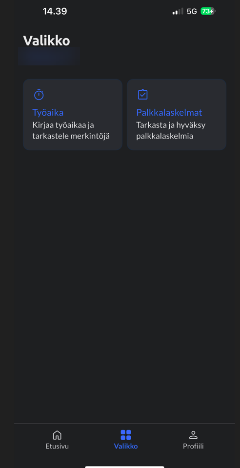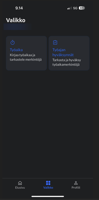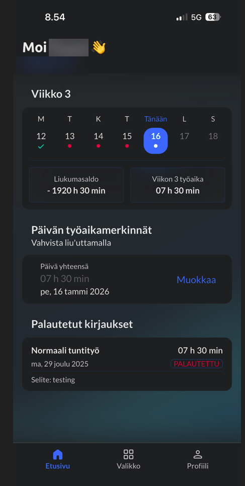 Yllä olevassa mobiilin kuvassa nähdään työajan kirjauksen etusivu. Samalla näkymällä nähdään myös jos työajan hyväksyjä on palauttanut palkansaajalle työajan kirjauksia. Palautetussa kirjauksessa näkyy myös työajan hyväksyjän lisäämä selite, mikä kertoo miksi työajan kirjaus on palautettu palkansaajalle. Jos palkansaaja haluaa korjata työajan merkintää, pitää korjattava työajan merkintä esnpoistaa ja lisätä uudelleen.