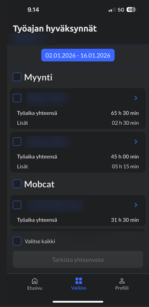 Työaikojen hyväksyjä-roolillinen käyttäjä näkee Netvisorin mobiilin valikossa oman osion, Työajan hyväksynnät, jossa käyttäjä voi hyväksyä hänelle määriteltyjen tiimien jäsenten työaikamerkinnät.