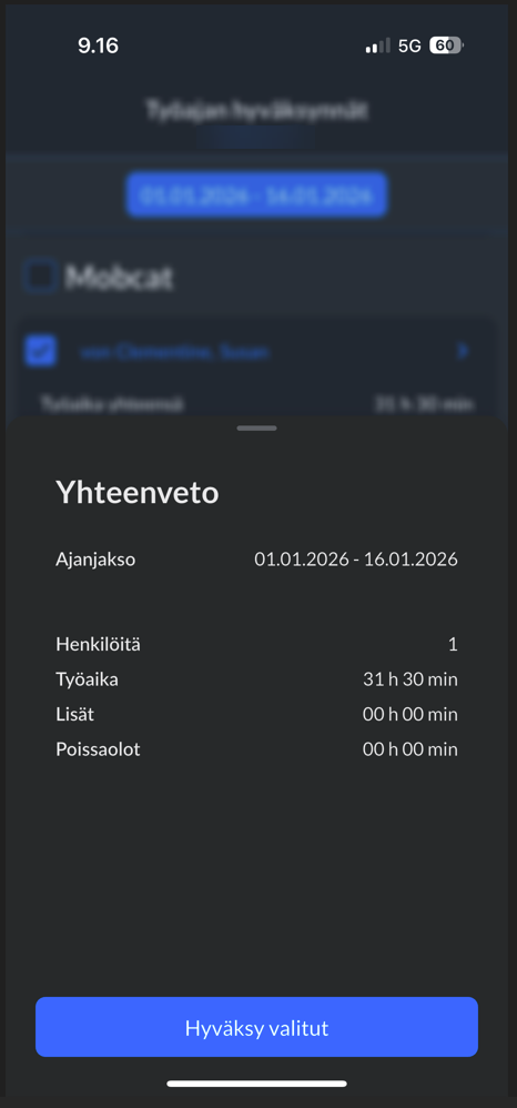- Hyväksy tunnit painamalla "Hyväksy valitut".
