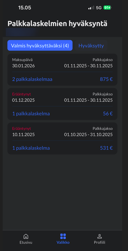 - Katso listaus palkkalaskelmista, jotka ovat valmiita hyväksyttäväksi, kohdasta "Valmis hyväksyttäväksi". Palkkalaskelmat on jaoteltu maksupäivän mukaan.