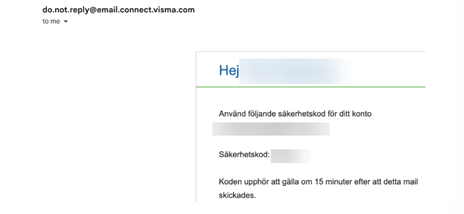 Det kan ta 2-3 minuter innan meddelandet från Visma Connect anländer. Kontrollera även skräppostfiltret.