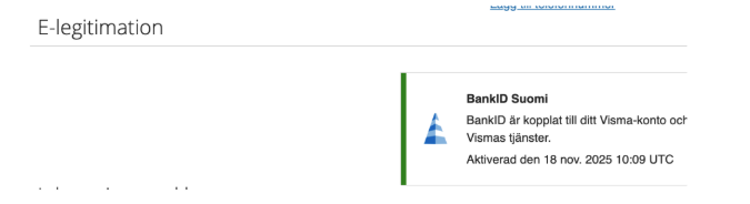 - Kontrollera att kopplingen är klar. En lyckad koppling visas som "BankID Suomi är kopplat till ditt Visma-konto".